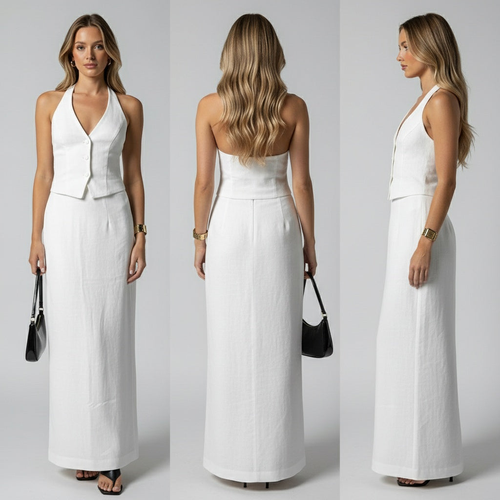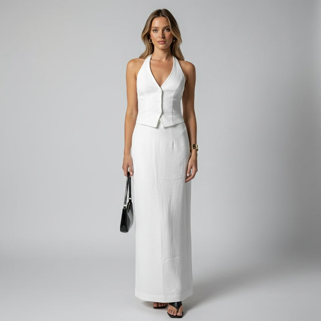 Effortlessly elevate your warm-weather wardrobe with the Noe Arlen Set — a sleek, two-piece skirt co-ord designed for bold yet refined streetwear appeal. This sleeveless V-neck top pairs seamlessly with a matching slim-fit skirt, creating a clean, confident silhouette perfect for everything from work meetings to city strolls. Crafted from breathable cotton, this set offers the ideal blend of structure and softness for summer days on the move.